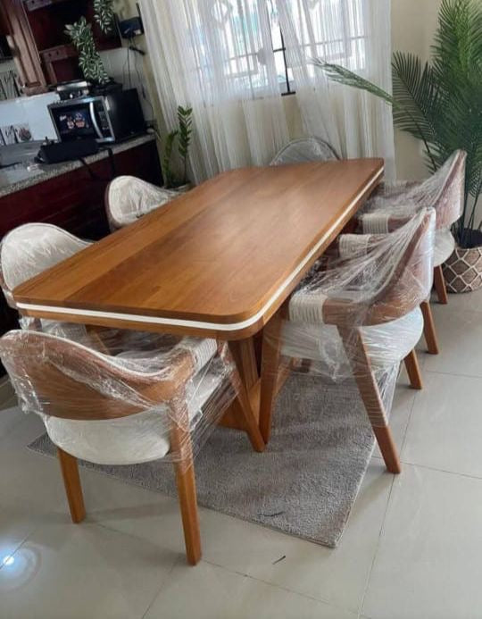 Ver todos los detallesElegante juego de comedor en madera de caoba, sus sillas color natural cuentan con respaldo y asientos tapizados en vinil blanco, brindando comodid...