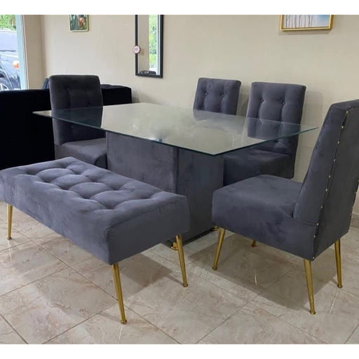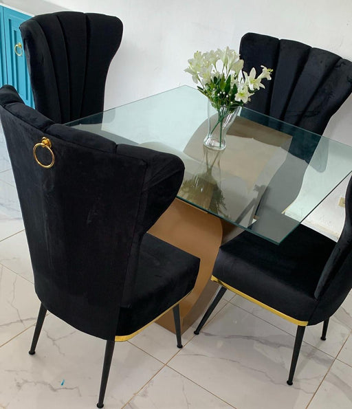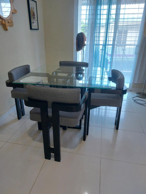 Comedor 4 silla tapizado rallado tope de cristal 3/8  centro de madera pino americano tratado  tela Micro fibra negro cada silla cuenta con desliza...