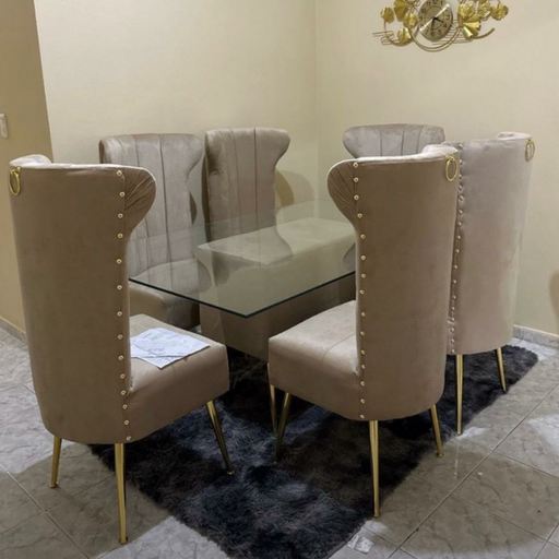 Comedor 4 silla tapizado capitoneado  tope de cristal 3/8  centro de madera pino americano tratado  tela Micro fibra crema  cada silla cuenta con...
