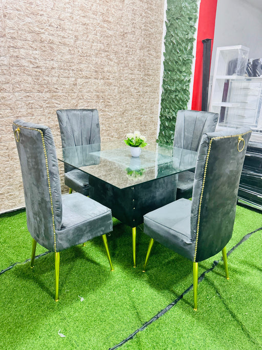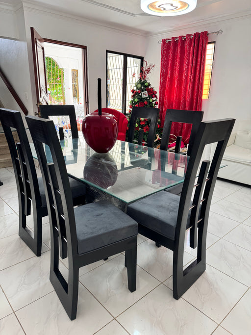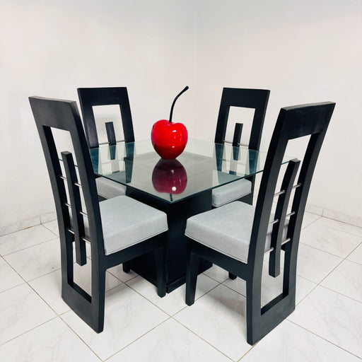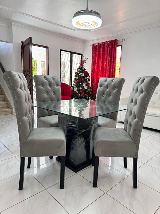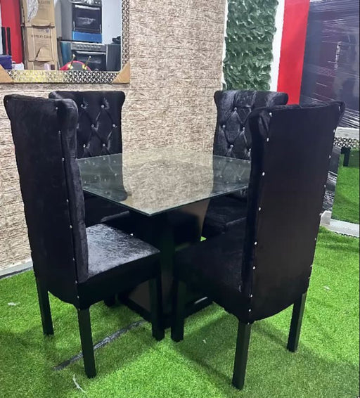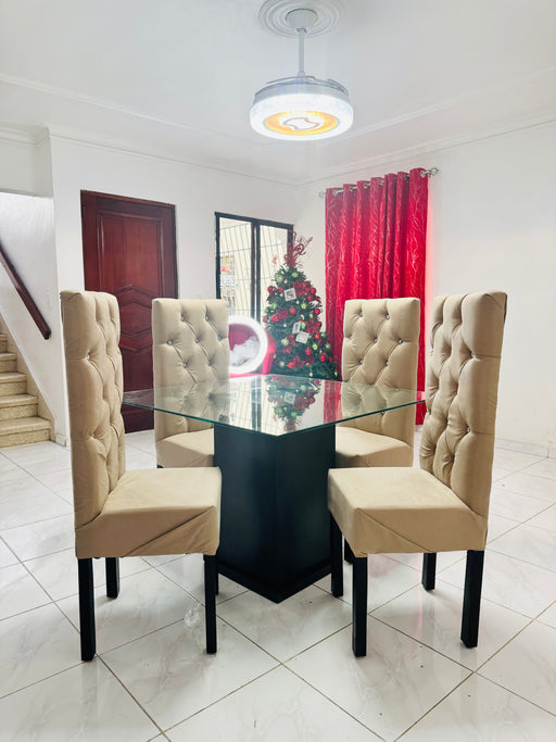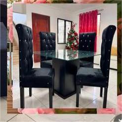 COMEDOR TAPIZADO CAPITONEADO NEGRO DE 4 SILLA CON TOPE DE CRISTAL