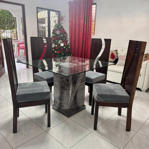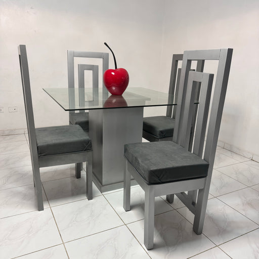 Comedor Moderno 4 Sillas con Tope de Cristal     Eleva el estilo de tu hogar con este elegante comedor fabricado en pino americano de alta calida...