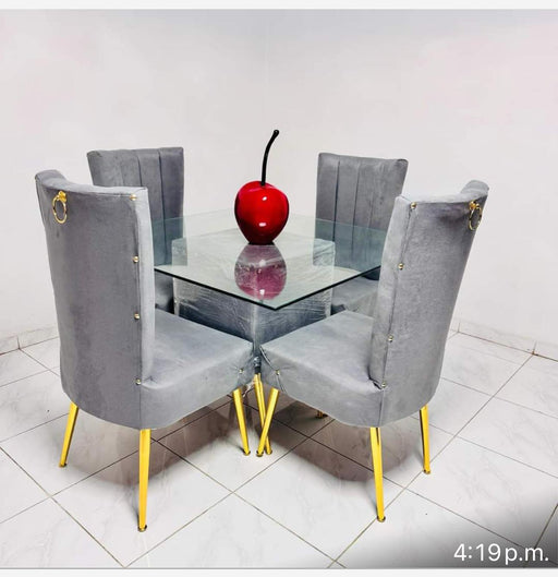 Comedor tapizado beige 4 silla pata de metal tope de cristal