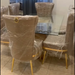 Comedor tapizado beige cuatro sillas rayado patas de metal con aplicaciones doradas en el frente