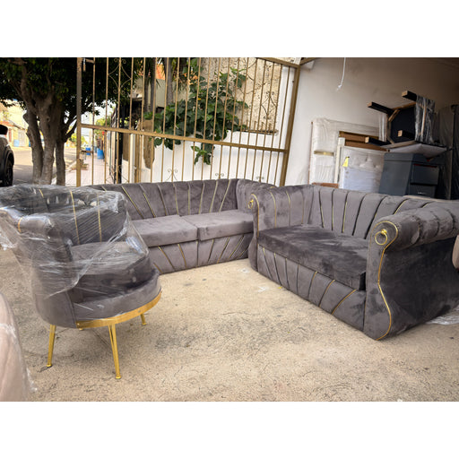 Juego de mueble L capitoneado para 3 personas . brazos con lámina Dorada.