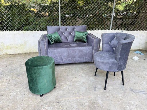 juego de muebles 3 y 2 de almohadones, con mesa de centro tapizada. disponible es gris, negro y beige