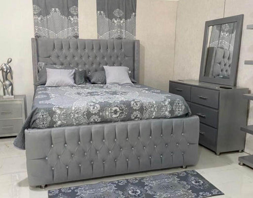 JUEGO DE HABITACION GRIS CAPITONEADO CON COLCHON ORTOPEDICO EN 60¨, INCLUEYE 2 MESITA DE NOCHE Y GABETERO