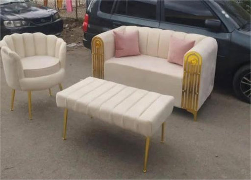 Juego de Mueble Crema con lineas Dorada Tela de Micro Fibra, Sofá de 2 Personas. incluye 2 otomanes y Cojines Decorativo.