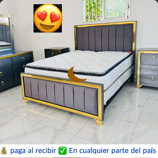 juego de habitación con espaldar tapizado con lamina dorada, disponible en tamaño, twin, full, queen y king colores, negro, beige, gris y blanco