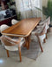 Elegante juego de comedor en madera de caoba, sus sillas color natural cuentan con respaldo y asientos tapizados en vinil blanco, brindando comodidad y un toque moderno que combina fácilmente con cualquier decoración..