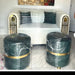 muebles blancos con dos otoman verde bola y su diseño en el medio dorado.